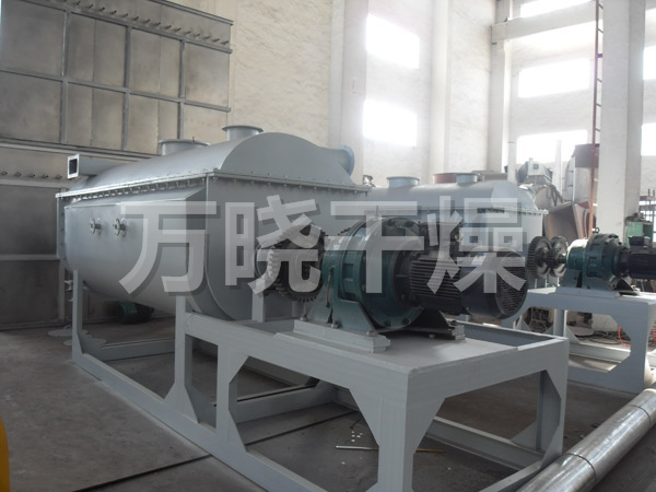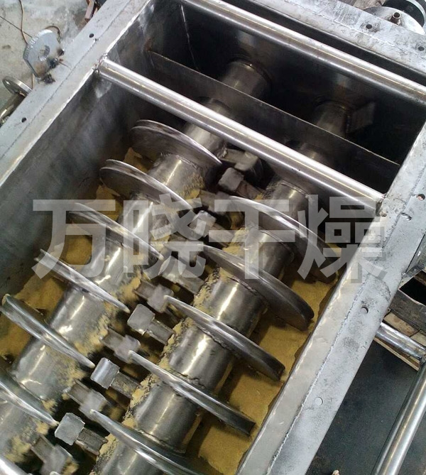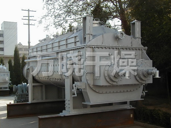 空心轴上密集排列着楔型中空浆叶,热介质经空心轴流经浆叶。单位有效容积内传热面积很大,热介质温度从-40℃到320℃,可以是水蒸汽,也可以是液体型:如热水、导热油等。间接传导加热,没有携带空气带走热量,热量均用来加热物料。热量损失仅为通过器体保温层向环境的散热。楔型浆叶传热面具有自清洁功能。物料颗粒与楔型面的相对运动产生洗刷作用,能够洗刷掉楔型面上附着物料,使运转中一直保持着清洁的传热面。浆叶干燥机的壳体为Ω型,壳体内一般安排二到四根空心搅拌轴。壳体有密封端盖与上盖,防止物料粉尘外泄而充分发挥作用。