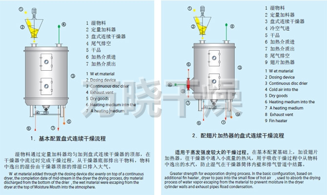 湿物料自加料器连续地加到干燥器上部第一层干燥盘上,带有耙叶的耙臂作回转运动使耙臂作回转运动使耙叶连续地翻抄物料。物料沿指数螺旋线流过干燥盘表面,在小干燥盘上的物料被移送到外缘,并在外缘落到下方的大干燥盘外缘,在大干盘上物料向里移动并从中间落料口落如下一层小干燥盘中。大小干燥盘上下交替排列,物料得以连续地流过整个干燥器。中空的干燥盘内通入加热介质,加热介质形式有饱和蒸汽、热水和导热油,加热介质由干燥盘的一端进入,从另一端导出。已干物料从最后一层干燥盘落到壳体的底层,最后被耙叶移送到出料口排出。湿份从物料中逸出,由设在顶盖上的排湿口排出,真空型盘式干燥器的湿气由设在顶盖上的真空泵口排出。从底层排出的干物料可直接包装。通过配加翅片加热器、溶剂回收冷凝器、袋式除尘器、干料返混机构、引风机等辅机,可提高其干燥的生产能力,干燥膏糊状和热敏性物 料,可方便地回收溶剂,并能进行热解和反应操作。