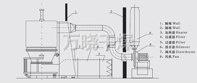 空气经加热净化后,由引风机从下部导入,穿过料斗的孔网板。在工作室内,经搅拌和负压作用形成流态化,水份快速蒸发后随着排气带走,物料快速干燥。