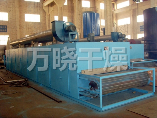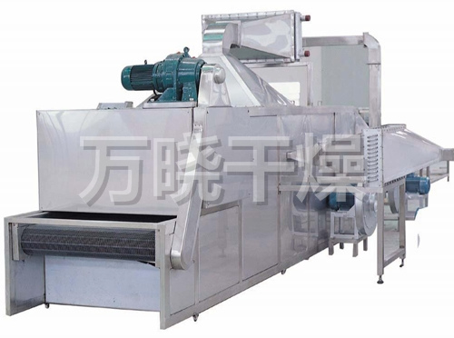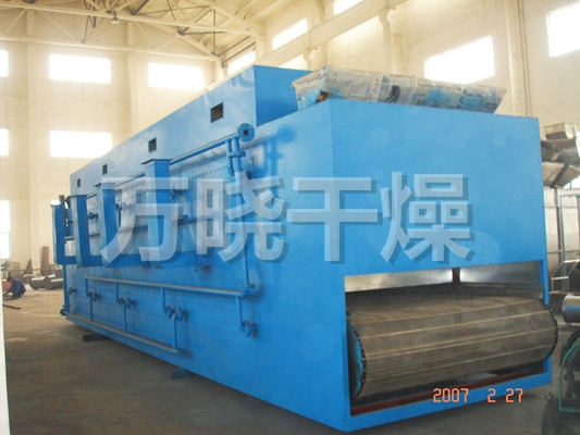物料由加料器均匀地铺在网带上,网带一般采用12-60目不锈钢丝网,由传动装置拖动在干燥机内移动。干燥机由若干单元组成,每一单元热风独立循环,部分尾气由专门排湿风机排出,废气由调节阀控制,热气由下往上或由上往下穿过铺满物料的网带完成热量与质量传递的进程,带走物料水份。网带缓慢移动,运行速度可根据物料温度自由调节,干燥后的成品连续落入收料器中。上下循环单元根据用户需要可灵活配备,单元数量亦可根据需要选取。
